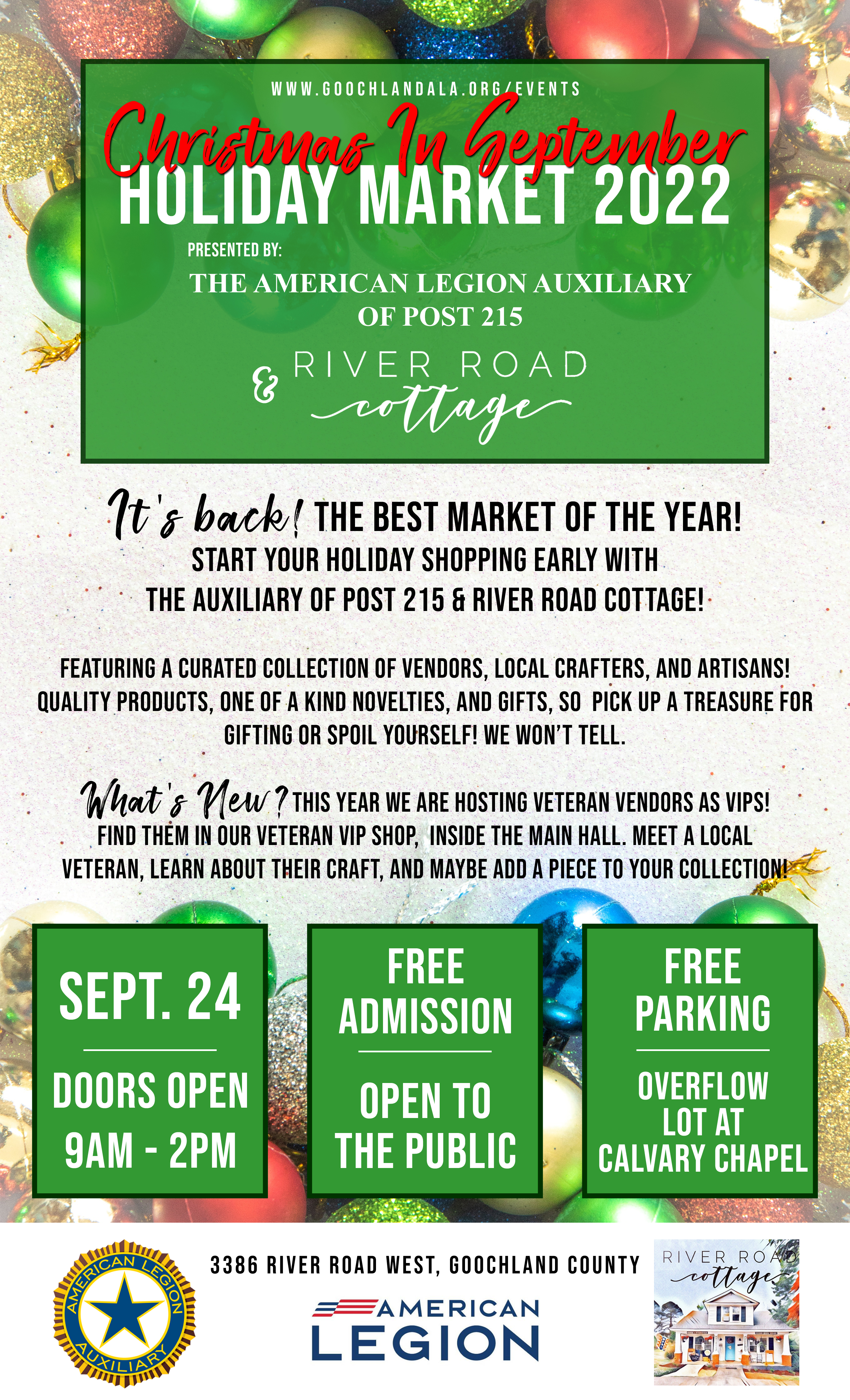 The American Legion Auxiliary of Post 215 and River Road Cottage proudly present 'Christmas in September! Holiday Market 2022' - Come shop 'til you drop with Local Artisans and Vendors. Doors open to the public at 9AM.